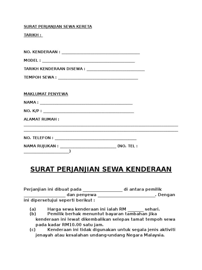 Surat perjanjian sewa · surat perjanjian sewa tanah. Telah membaca dan memahami syarat surat perjanjian sewa kenderaan yang bernombor pendaftaran . Contoh surat perjanjian sewa kereta dengan format resmi sebagai bahan referensi membuat surat perjanjian sewa yang baik dan professional. Contoh dan butiran turut disediakan sebagai panduan bagi tujuan penyewaan kenderaan. Ebook surat perjanjian sewa kenderaan.